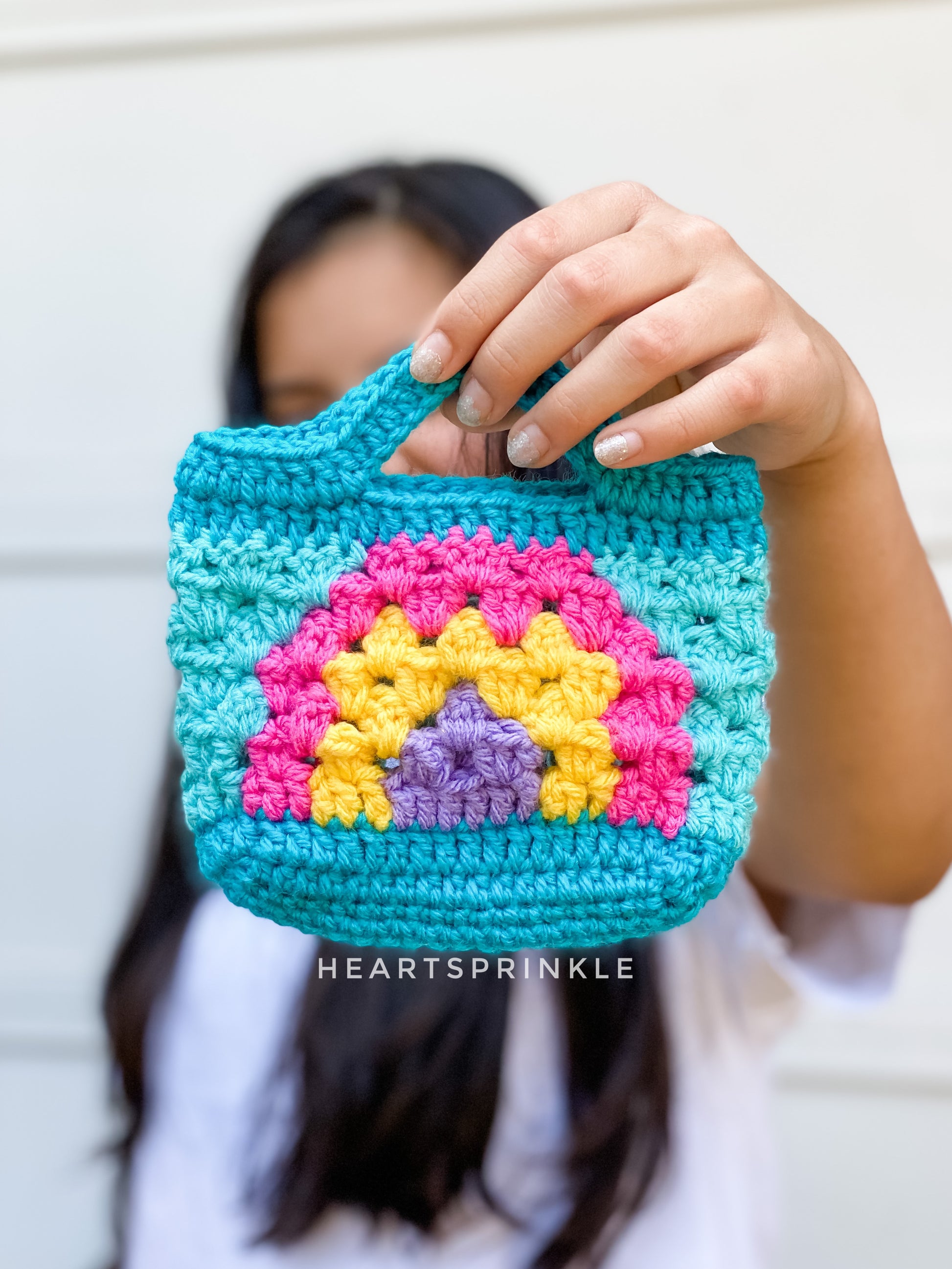 This beautiful crochet tote is perfect for shopping, running errands, or even school! You can make them in many color combinations and sizes. The mini ones are perfect for treat bags and party bags!